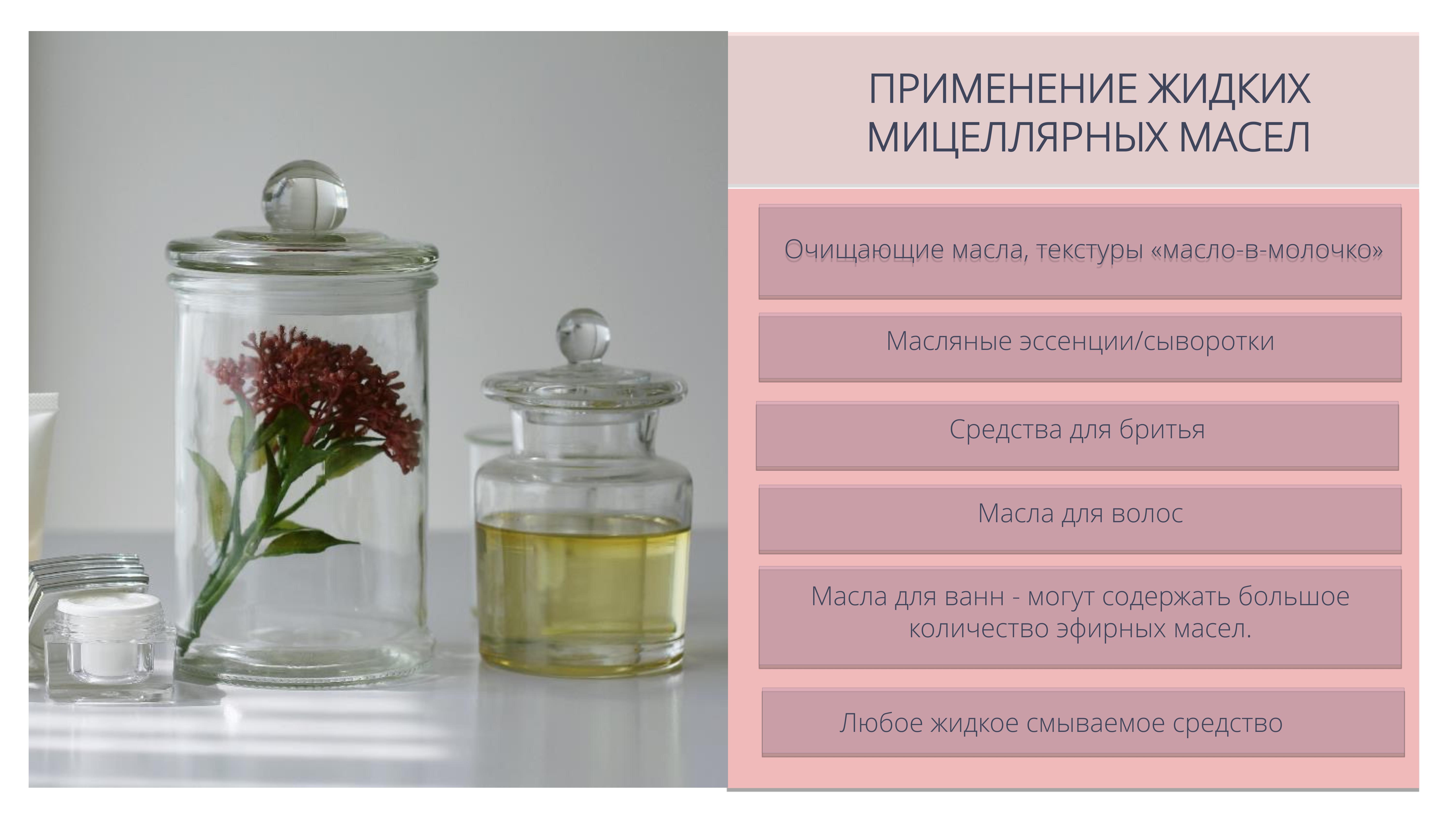 Позволяет создавать ультра актуальные прозрачные мицеллярные масла для очищения кожи и снятия макияжа, продукты для купания («молочные ванны»), гидрофильные масла для душа.