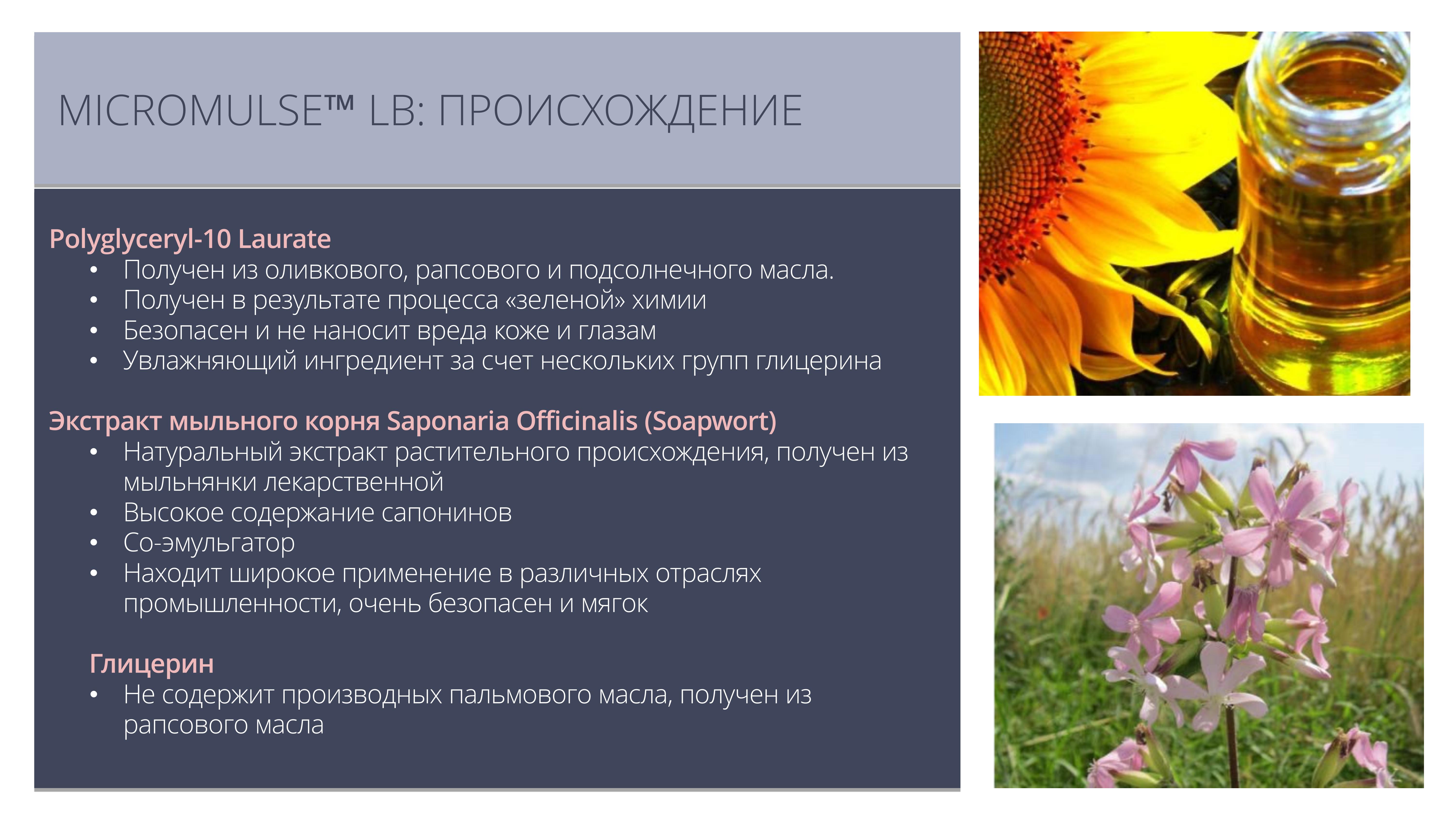 Продукты на основе Micromulse LB имеют высокую очищающую и увлажняющую способность.